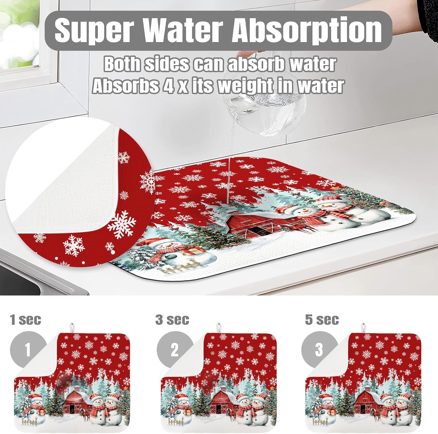 Dish Drying Mat for Kitchen Counter Large 16" x 18" Christmas Farmhouse Rustic Snowman Absorbent Microfiber Dishes Drainer Rack Mats Pad Reusable Washable
