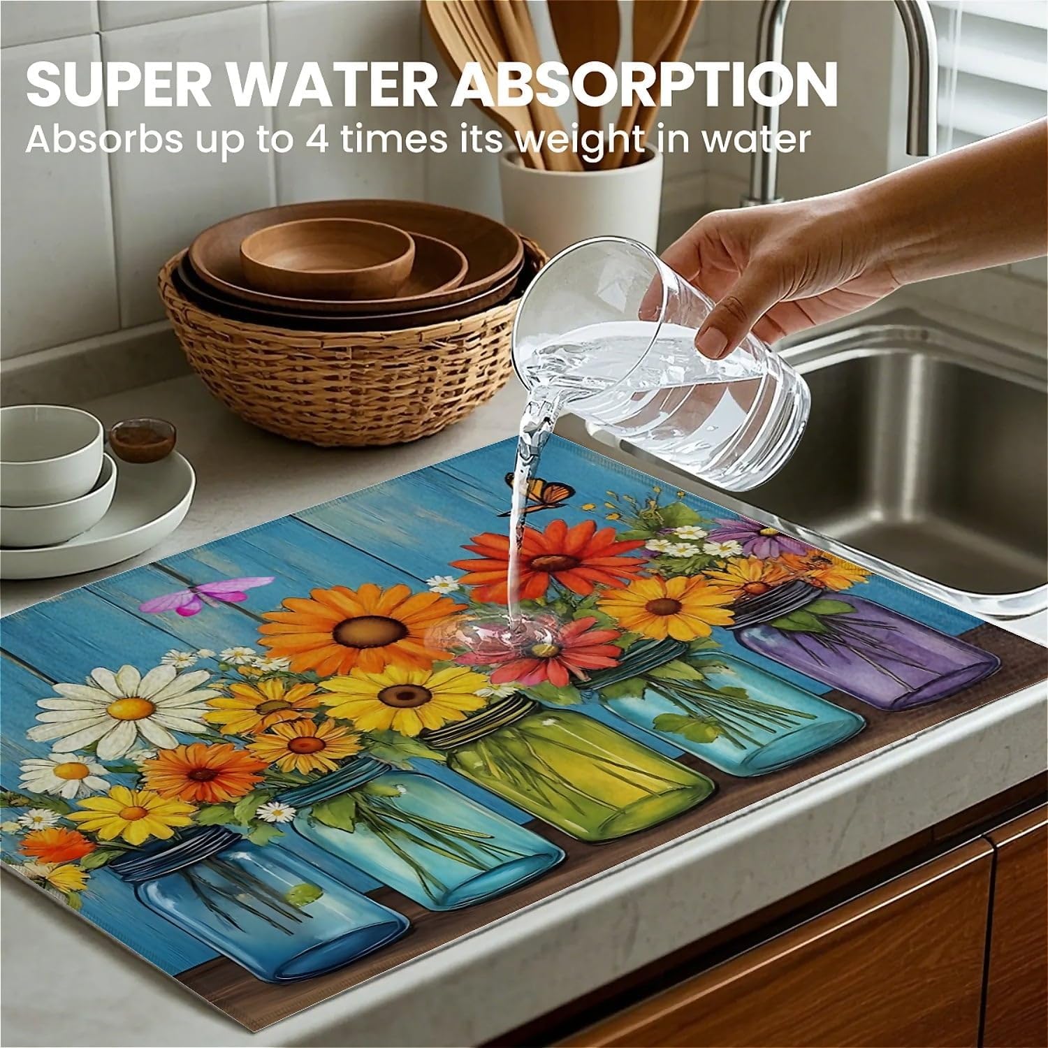 Dish Drying Mat For Kitchen Counter, Vintage Daisy Flower Microfiber Absorbent Dish Drainer Rack Pad Reusable Large 18x24in Drying Mat