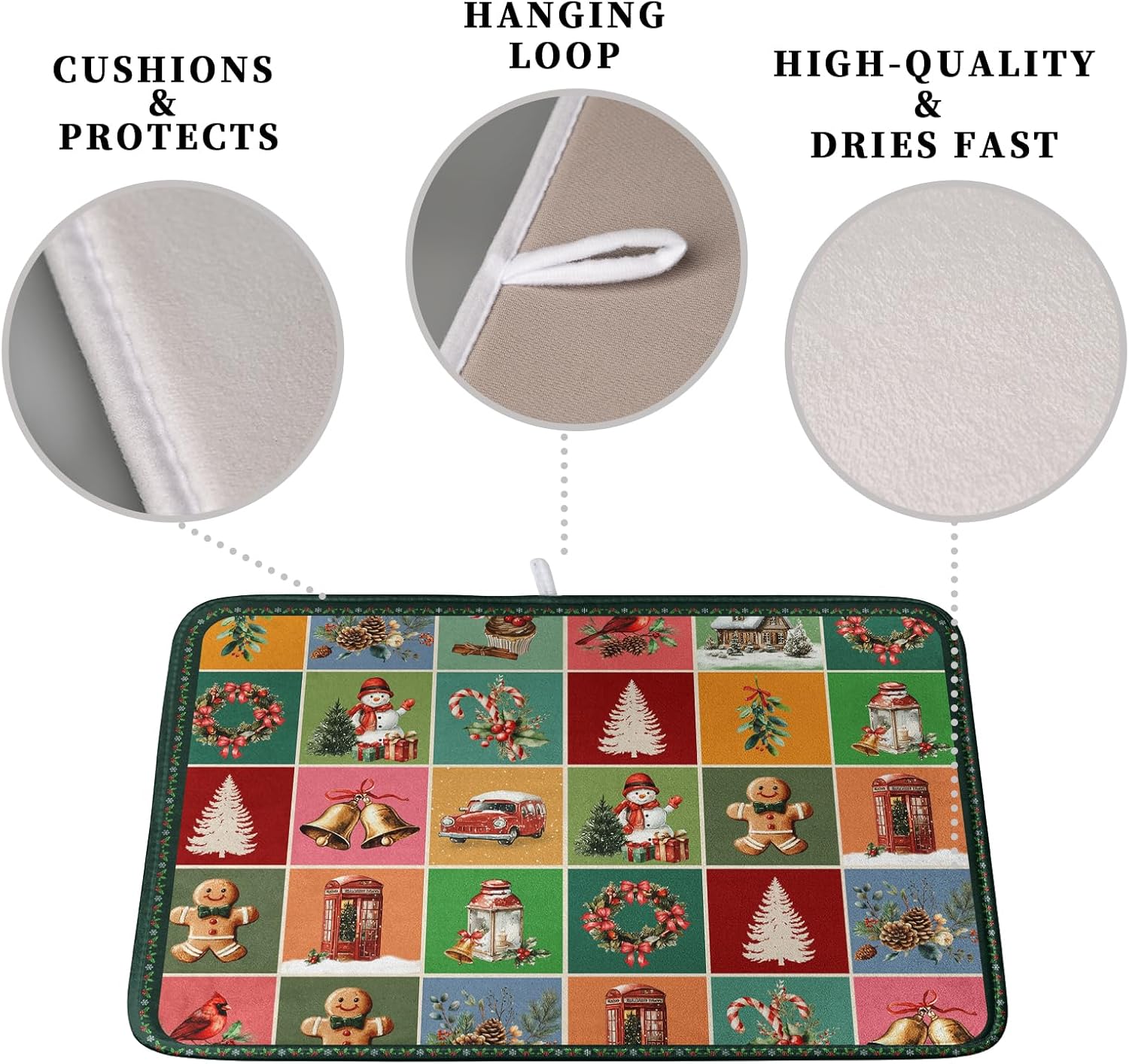 - Ultra Absorbency: The surface of the Christmas holiday dish drying mats for kitchen counter is made of absorbent microfiber and the middle is made of composite sponge, absorbs 4X its weight in water, keep your counter dry. Absorbent, Colorful, Reversible, do not fade
