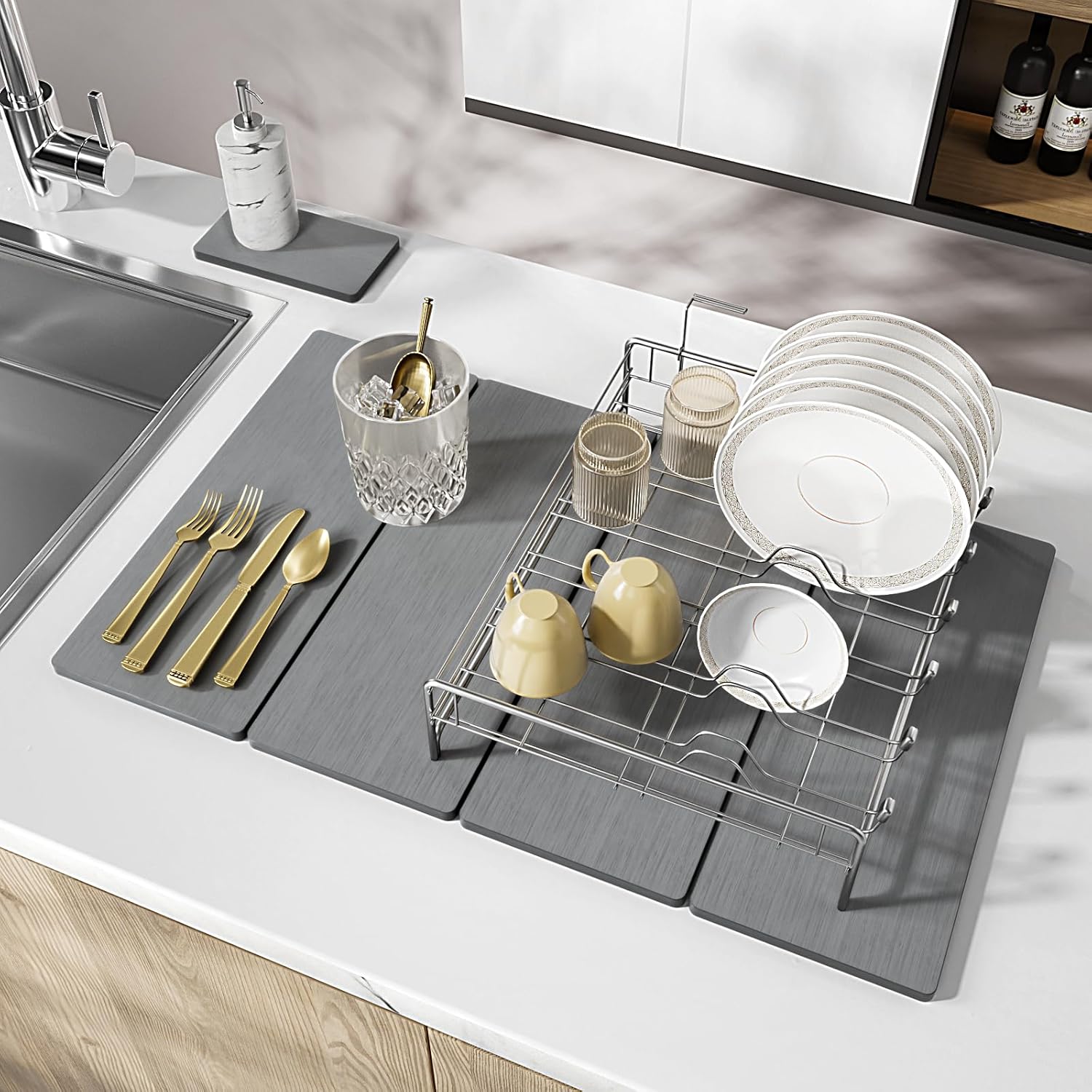 - 【Safe & Rapid Drying Technology】Harnessing the power of diatomaceous earth, millions of micropores enable rapid water absorption and evaporation. Free from harmful chemicals and safe for all ages, it protects your surfaces from water damage while keeping your kitchen hygienic and pristine.